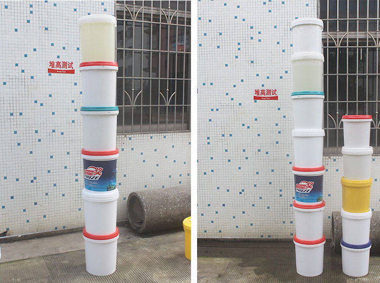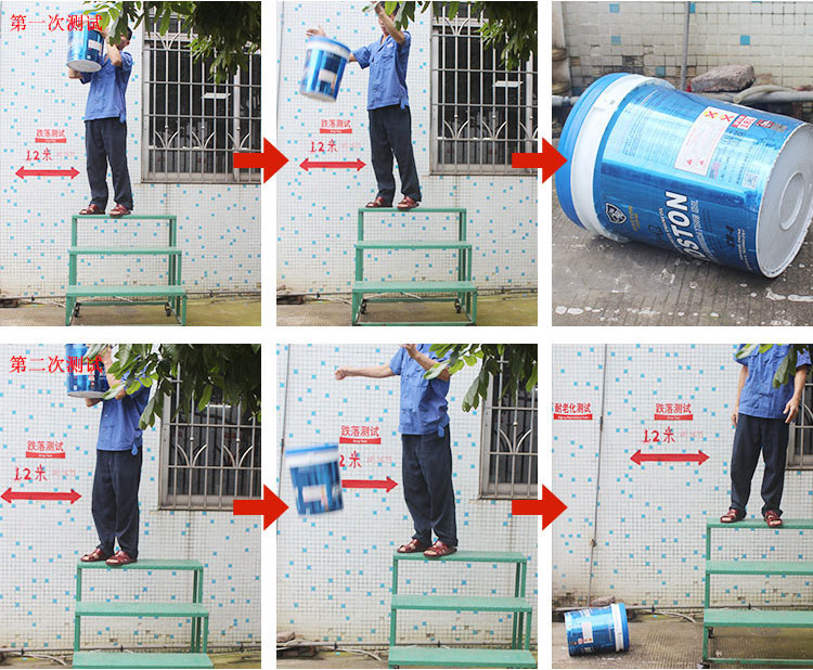 取三個試樣,分別注入公稱容量的水(shuǐ)並將蓋蓋緊,容量不大(dà)於11L的桶,跌落高度為1.5m;容量大於(yú)11L的桶,跌落高度為(wéi)1.2m,跌落時使試(shì)樣的桶底近似垂直地麵,桶側下部平行地麵撞擊水泥平(píng)地,每個試(shì)樣連續跌落3次,檢查試摔,撞擊時允許桶口有少量漏液。